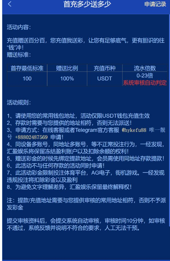 ✅USDT存款活动:首存最低100U送100U,上不封顶,流水倍数是1-23倍随机派送,必须要绑定经常用的U地址,彩金不能投注AG电子跟体育,其它没限制,先绑定好钱包联系下面的客服审核在存款。