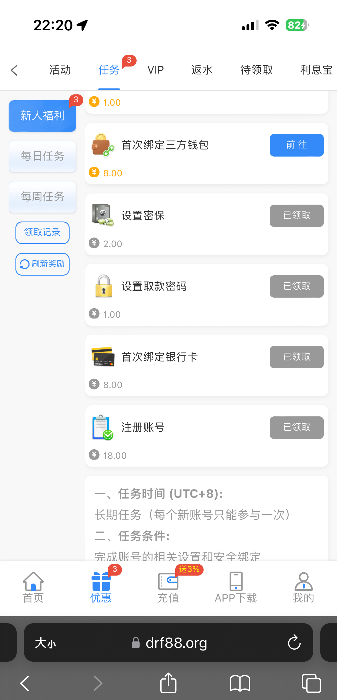 网址 drf88.com新人任务秒领18 其他任务一共领了29,注册直接点任务领取 没有就是黄了