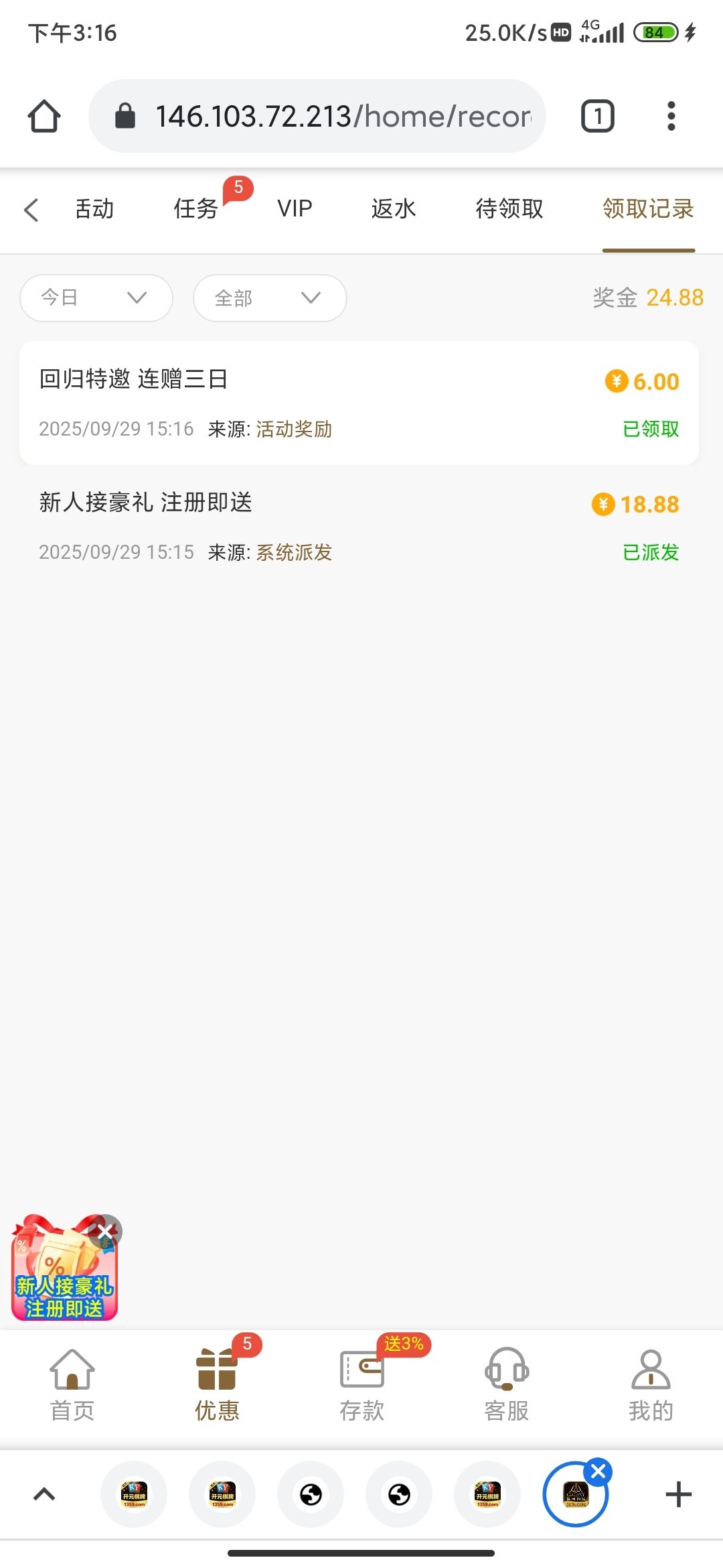 之前注册过没领到注册彩金可以登录下试试了,之前看老哥帖子注册没给,卡都没绑就退了,今天刚接到回归电话,连注册也一起给了网址72991.com