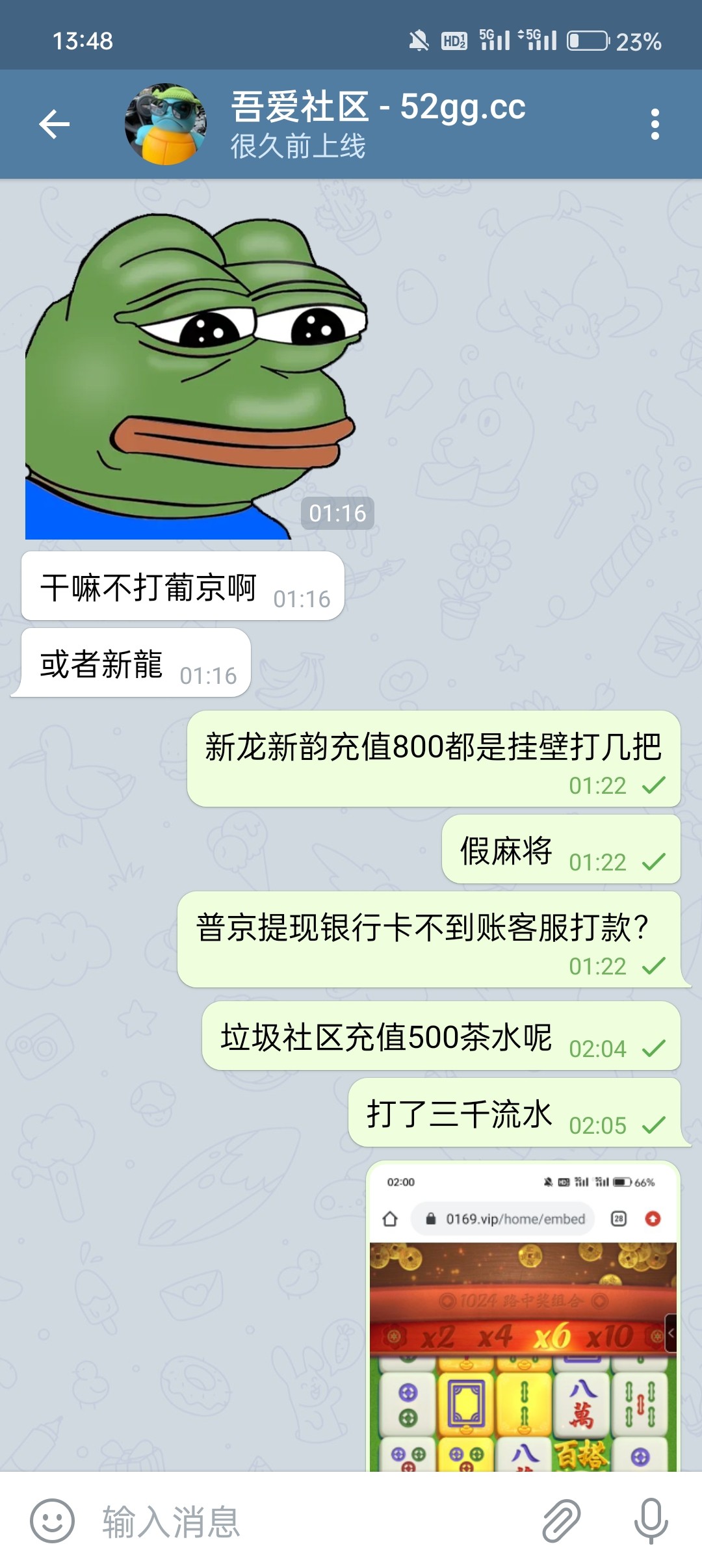 充值500不返现还说人家一直叫叫叫说人家是来混红包的笑死 说发不了红包给到游戏里 发信息跟死了一样避雷这种傻逼社区