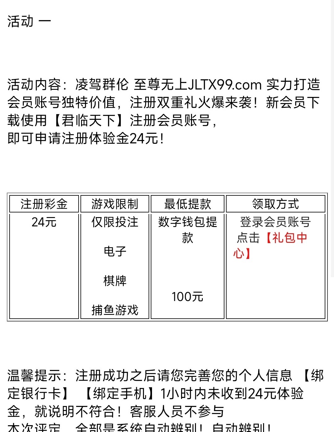 您好,由于活动火爆!系统风控发现很多洗水套利团队,为保障每个会员的账户安全!请您充值50元或以上核实为本人操作,即可正常游戏提现!