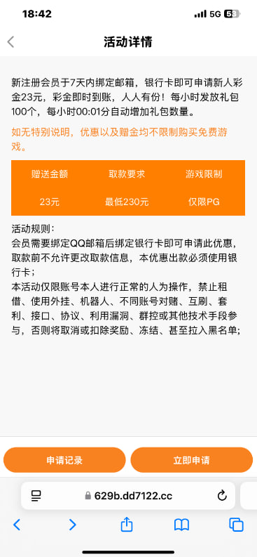 新用户注册绑定信息,需要绑定QQ邮箱跟银行卡,可以申请23彩金,出款自测,禁止充值!